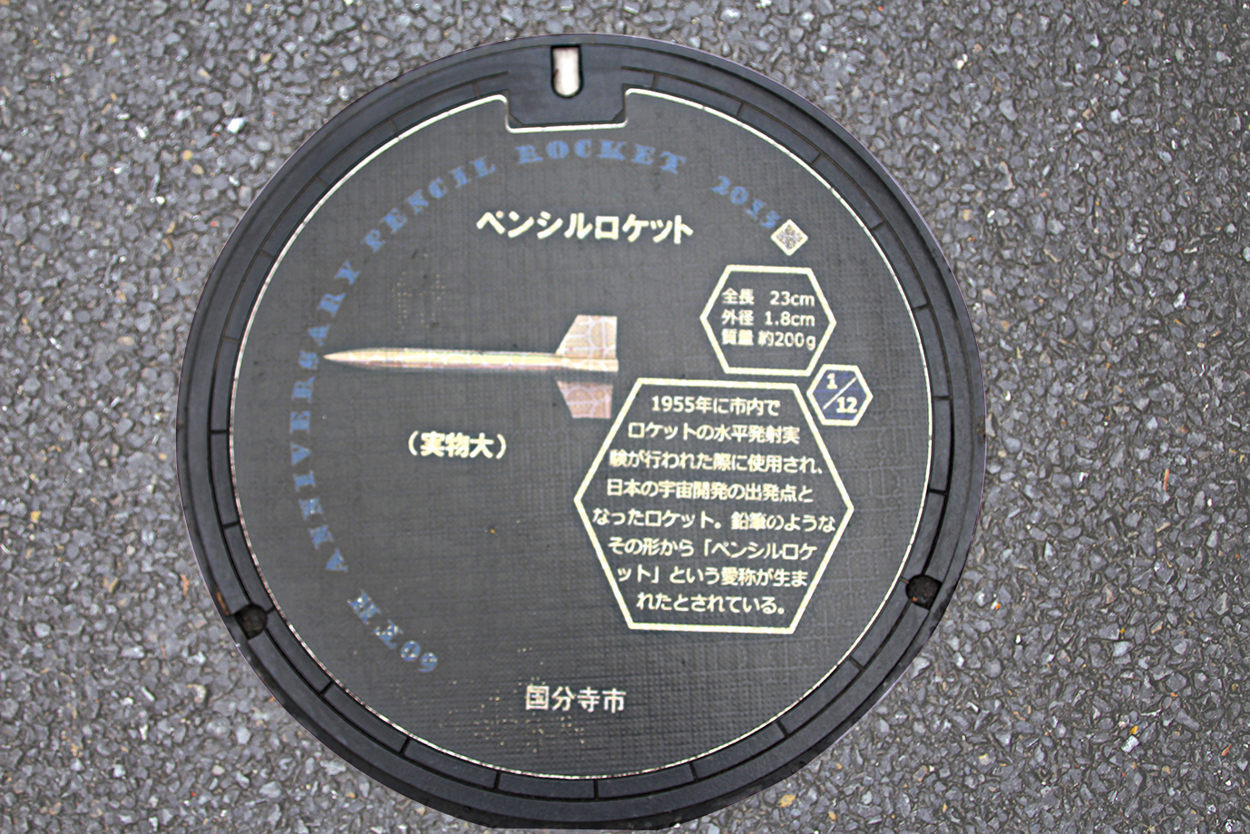 2005年(平成17年)には実験地である早稲田実業学校の校門前に「日本の宇宙開発発祥の地」の顕彰碑が設置されました。2015年(平成27年)には、国分寺駅北口から顕彰碑までの歩道に、これまで活躍した日本のロケット12種類がそれぞれ描かれたマンホールのふたを設置。歩きながら、それぞれのロケットの大きさや特徴などを学ぶことができるようになりました。